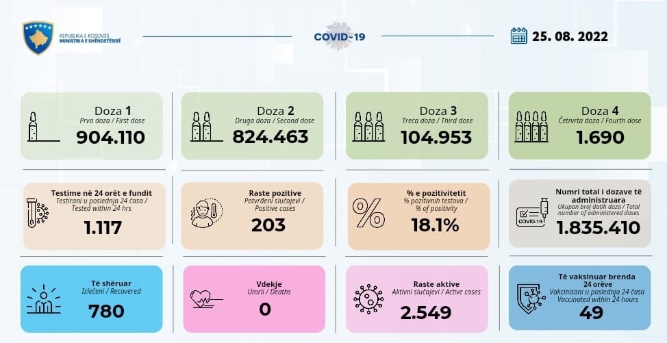 Ministria e Shëndetësisë bën të ditur se në 24 orët e fundit janë shënuar 203 raste të reja me Covid-19 nga 1,117testime.