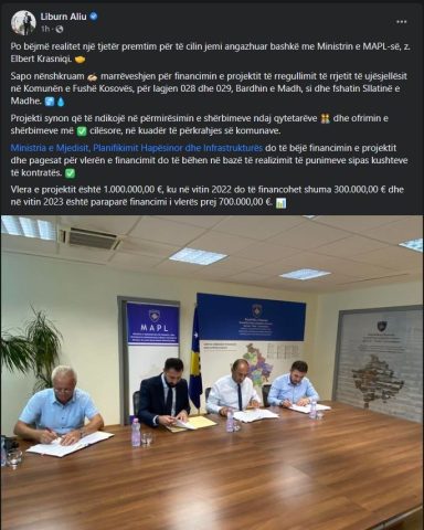 “Sapo nënshkruam marrëveshjen për financimin e projektit të rregullimit të rrjetit të ujësjellësit në Komunën e Fushë Kosovës, për lagjen 028 dhe 029, Bardhin e Madh, si dhe fshatin Sllatinë e Madhe”.