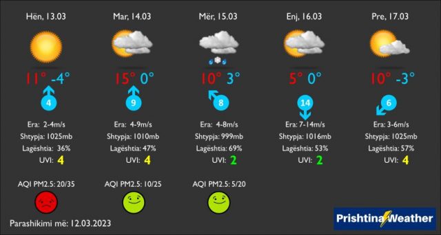 Sipas Prishtina Weather, java fillon me ngrica e kthjellime, pastaj të martën temperaturat në rritje, ndërsa nga mesi i javës sërish reshje shiu e bore, dhe rënie e temperaturave.