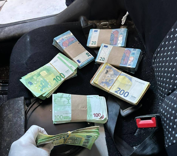 Fillimisht, tek tre personat janë gjetur nga 10 000 (dhjetë mijë) euro bankënota, gjersa gjatë kontrollit të mëtejshëm në një qese plastike të fshehur nën ulësen e prapme të automjetit është gjetur edhe një shumë prej 45 000 (dyzet e pesë mijë) euro bankënota të padeklaruara.