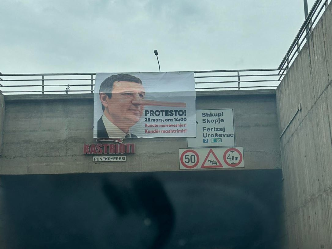 Në disa lokacione të ndryshme, PSD vendosi banerë me figurën e kryeministrit Albin Kurti, i cili duket si “Pinokio”, një personazh i njohur i filmave vizatimor që aty njihet për “gënjeshtra”.