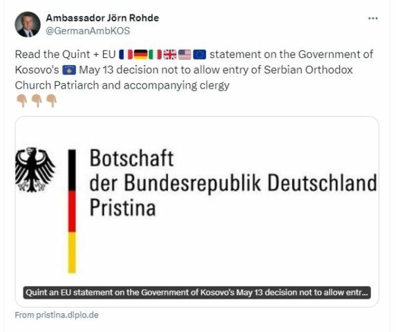 Shtetet e QUINT-it kanë reaguar pasi Kosova nuk ia ka lejuar hyrjen në territorin e Republikës së Kosovës, Patriarkut Porfirie të Kishës Ortodokse Serbe.