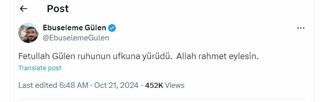 Nipi i tij, Ebuseleme Gylen, ka njoftuar për vdekjen e Fethullah Gylenit. Në deklaratën e tij në platformën ‘X’, Ebuseleme Gylen ka shkruar se ‘Fetullah Gylen shkoi në horizontin e shpirtit të tij. Zoti e mëshiroftë!’.
