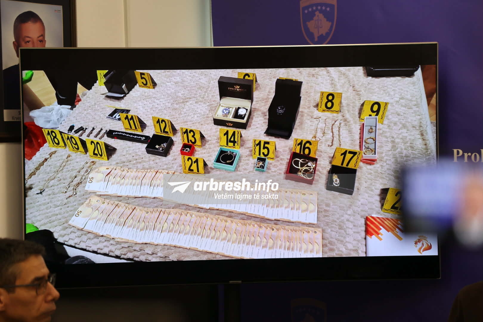 Në konferencën e thirrur nga Prokuroria e Prizrenit janë publikuar edhe disa fotografi nga paratë, stolit e arit e orat e shtrenjta që janë sekuestruar në bastisjen e sotme nëpër shtëpi e apartamente të të lartcekurve.