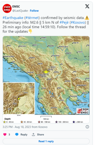 #Earthquake (#tërmet) confirmed by seismic data.⚠Preliminary info: M2.6 || 5 km N of #Pejë (#Kosovo) || 26 min ago (local time 14:59:10). Follow the thread for the updates? pic.twitter.com/FAsmJHLnz0