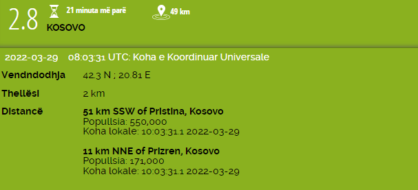 Sipas EMSC, epiqendra e tërmetit ka qenë 11 kilometra afër Prizrenit, ndërsa thellësia e tërmetit ka qenë 2km./arbresh.info/