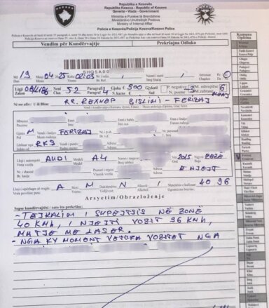 Policia e Kosovës ka gjobitur një 20-vjeçar në Ferizaj, i cili në zonën me kufizim shpejtësie prej 40 km/h, ka lëvizur me 96 km/h.
