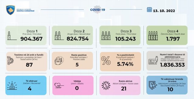Ministria e Shëndetësisë së Kosovës ka njoftuar se janë gjithsej 21 raste aktive me COVID-19 në Kosovë.