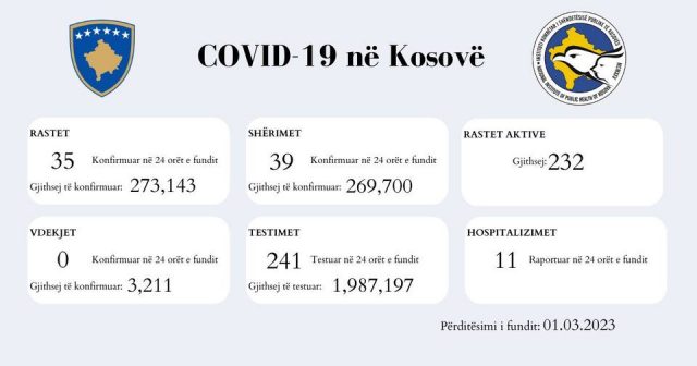 Instituti Kombëtar i Shëndetësisë Publike ka njoftuar se gjatë 24 orëve të fundit janë konfirmuar 35 raste të reja me COVID-19, pas 241 testimeve të bëra.