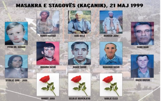 Masakra e Stagovës është në mesin e 15 masakrave më të tmerrshme që ndodhura në Kosovë dhe që për të ish-liderët e regjimit kriminal të Serbisë në krye me kriminelin Sllobodan Millosheviq u akuzuan nga Gjykata për Krime lufte në Ish-Jugosllavi për krime lufte me seli në Hagë, por që askush nuk u dënua për këtë krim makabër!.