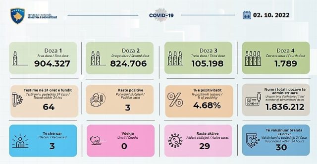 Ministria e Shëndetësisë ka bërë të ditur se gjatë 24 orëve të fundit në Kosovë janë regjistruar tri raste pozitive me COVID-19.