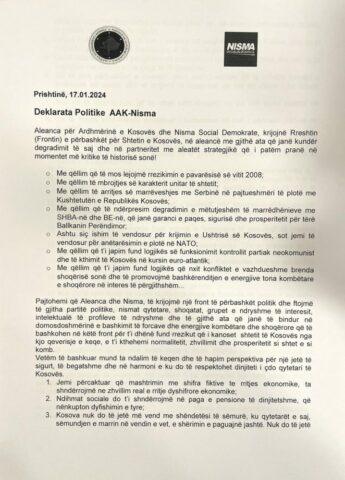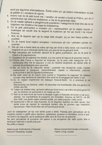 Teksti me Deklaratën Politike, me 18 pika, të cilën e nëshkruan krerët e dy partive, Ramush Haradinaj dhe Fatmir Limaj: