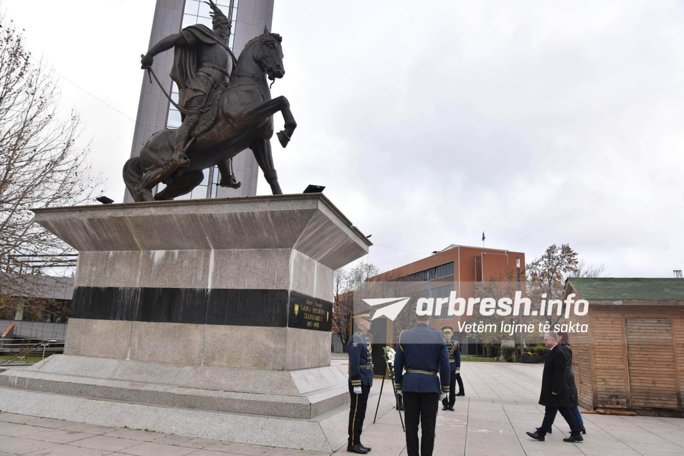 Kështu edhe zëvendëskryeministri i Kosovës , Besnik Bislimi bashkë me zëvendës kryeministren, Emilia Rexhepi, kanë bërë nderimet e tyre para shtatores së Gjergj Kastritoti Skënderbe në Prishtinë. /arbresh.info/
