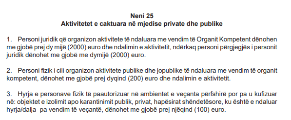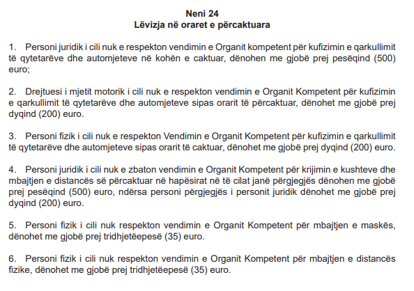 Bazuar në Ligjin për Parandalimin dhe Luftimin e Pandemisë COVID-19, qytetarët që nuk e respektojnë vendimin për kufizimin e qarkullimit të qytetarëve dhe automjeteve, dënohen me gjobë deri në 200 euro. Për persona juridikë, gjoba është 500 euro.