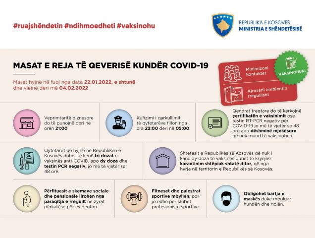 Qeveria e Kosovës, ka miratuar masat e reja anti-COVID-19, ku ora policore nis nga 22:00 deri në 05:00. Ndërsa, do të jenë të hapura deri në orën 21:00, ndërsa muzika lejohet deri në 20:30.