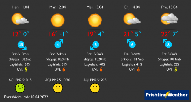 Ditëve të ardhshme, në javën e dytë të prillit, po parashihen kushte të motit të qëndrueshëm, e të thatë. Do të ketë më shumë kthjellime e diell. Në pjesën e dytë të javës edhe vransira kalimtare, derisa edhe temperaturat do të shënojnë rritje edhe mbi 20C.