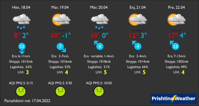 17.04.2022 – Të ftohtit që po depërton ditën e sotme mbi vend, mbetet prezent edhe ditëve të para të javës. Kushtet meteorologjike do të jenë mjaft dinamike, që do të kemi mot të ndryshueshëm, me vransira, intervale me diell, e priten edhe të reshura lokale shiu, e në vise kodrinoro-malore edhe të borës. Edhepse herë herë nuk përjashtohet mundësia që fjolla bore të bien edhe në pjesë të ulëta të vendit.