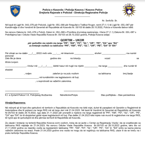 Policia e Kosovës përmes një kumtese për media ka treguar se si duket dokumenti i masës së qortimit, e cila do të aplikohet nga zyrtarët policorë në gjithë territorin e Republikës së Kosovës, përfshirë edhe në pikat e kalimit kufitar.