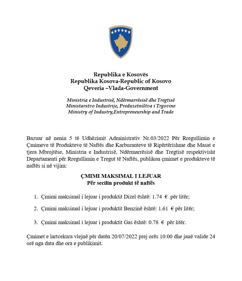 Ministria e Industrisë, Ndërmarrësisë dhe Tregtisë ka publikuar çmimet e derivateve për 24 orët e ardhshme.