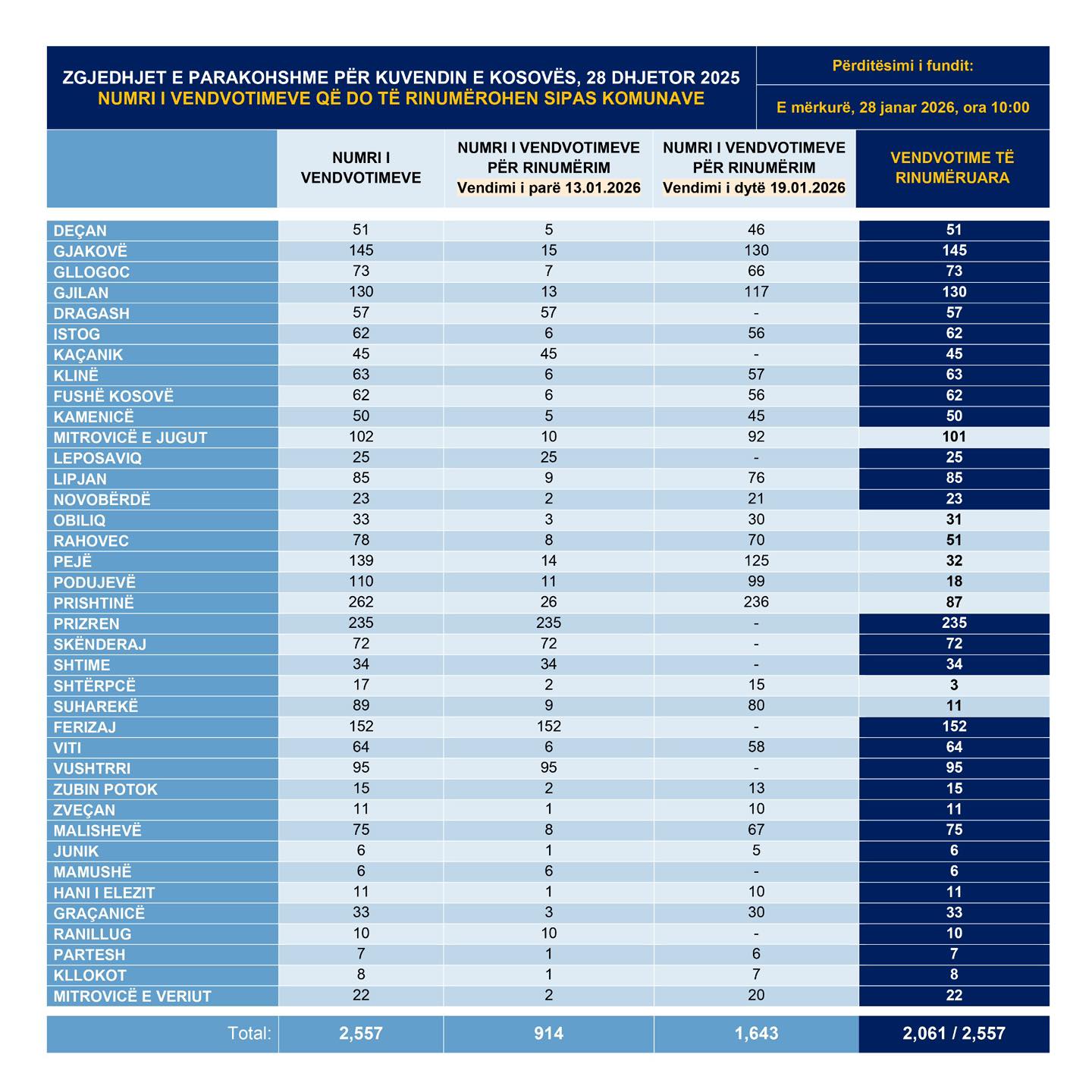 Nga fillimi i këtij procesi më 13 janar 2026, ora 18:00, deri më 28 janar 2026, ora 10:00, janë rinumëruar 2,061 nga 2,557 vendvotime, që përbën mbi 80% të totalit të vendvotimeve për të cilat KQZ ka marrë vendim për rinumërim./Arbresh.info