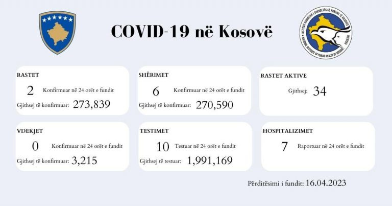 Gjatë 24 orëve të kaluara nuk u shënua asnjë viktimë teksa u regjistruan dy raste të reja dhe gjashtë raste shërimi nga COVID-19./Arbresh/info/