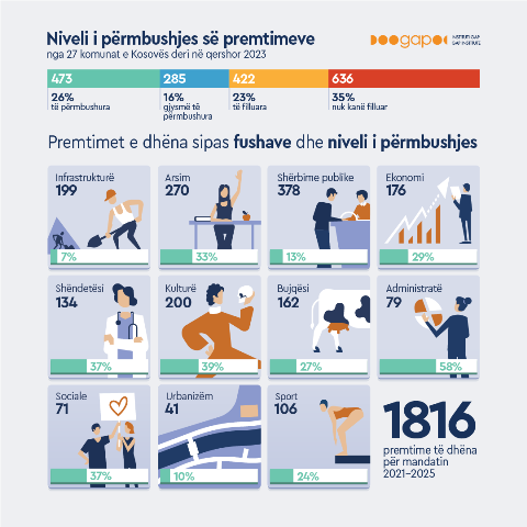 “Nga gjithsej 1,816 premtime të 27 kryetarëve të komunave, 473 premtime (26%) janë përmbushur, 285 premtime (16%) janë gjysmë të përmbushura, 422 premtime (23%) janë të filluara, dhe 636 (35%) e premtimeve mbeten të pa filluara.”, thuhet në raportin e Institutit për mandatin 2021-2025, përditësim ky i cili përfshin periudhën deri në fund të qershorit.