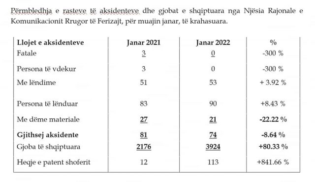 Sipas të dhënave të Policisë në Ferizaj në janarin e vitit të kaluar kanë ndodhur 3 aksidente me fatalitet me tre persona të vdekur.