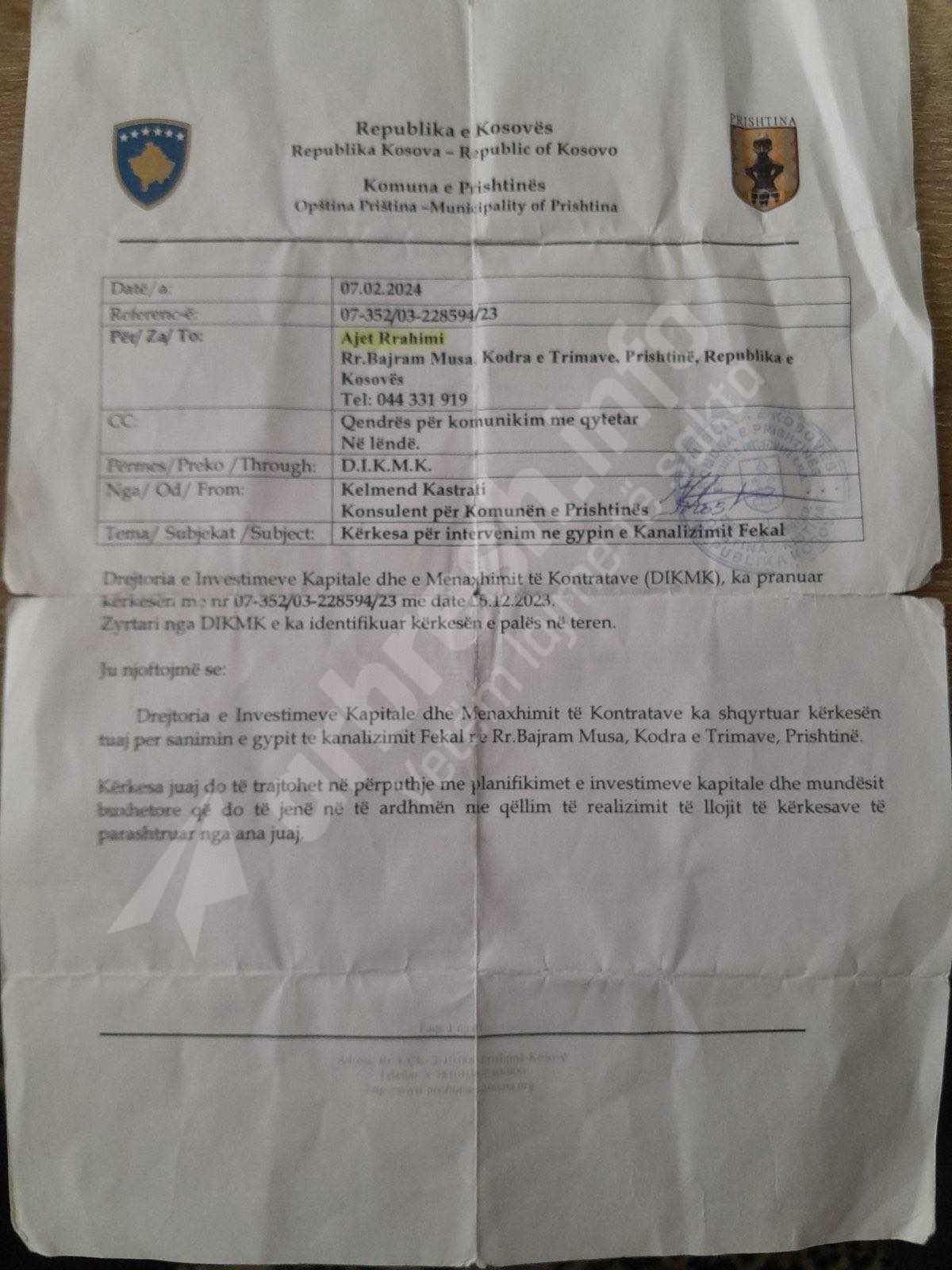 Dokumenti tregon se në vitin 2023 është paraqitur kërkesë në Drejtorinë e Investimeve Kapitale dhe e Menaxhimit të Kontratave (DIKMK) për intervenim në gypin e kanalizimit fekal.