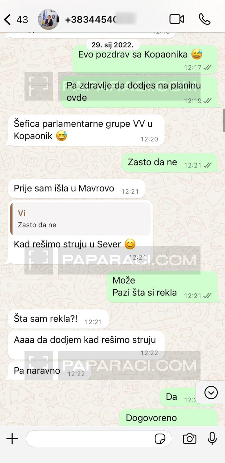 “Shefja e Grupit Parlamentar të VV-së në Kopaonik [qesh]”, i përgjigjet ajo ftesës së Simiqit, tregon biseda e parë mes tyre.