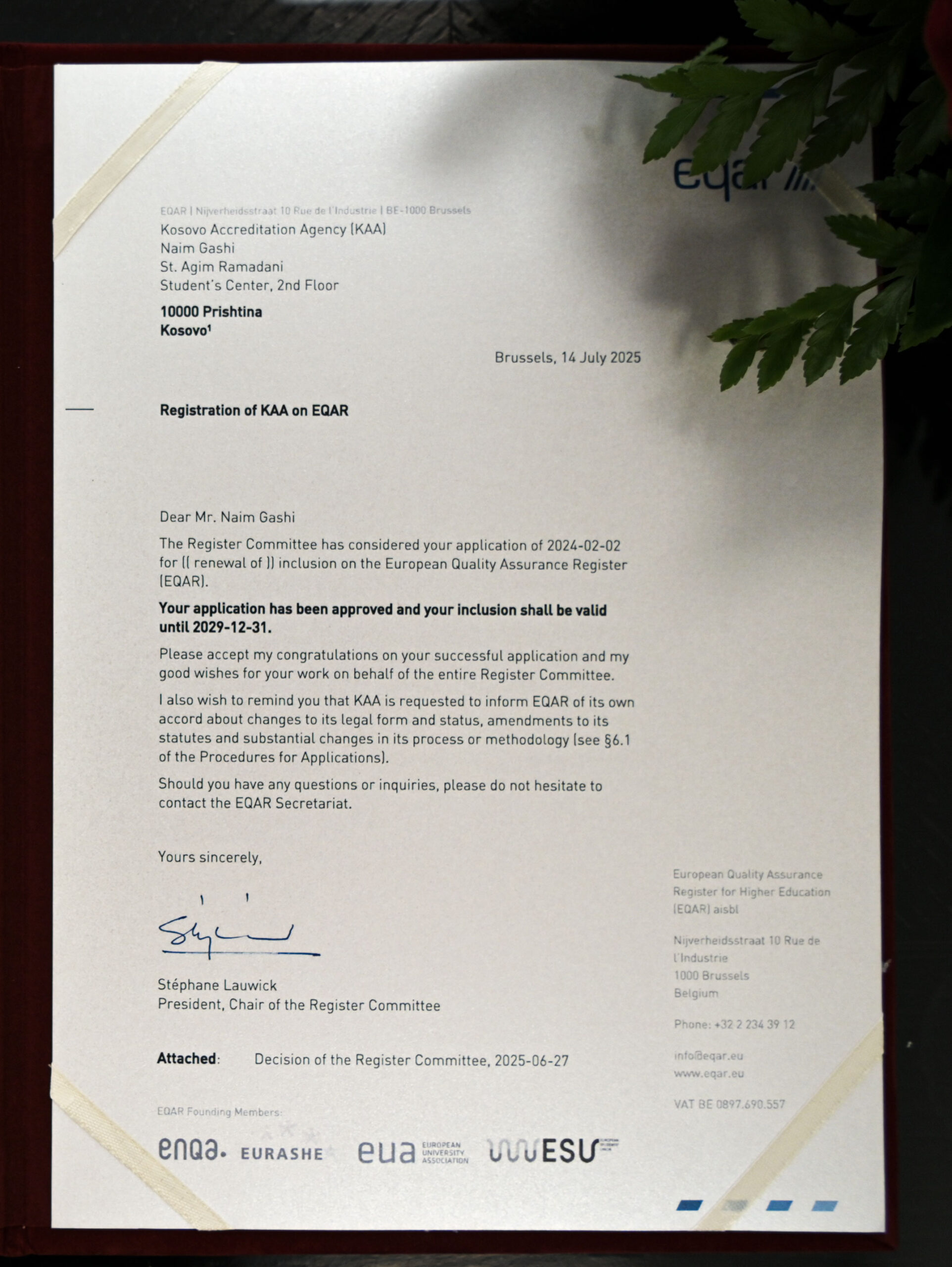 “Anëtarësimi me të drejta të plota në Regjistrin Evropian për Sigurimin e Cilësisë në Arsimin e Lartë (EQAR) të Agjencisë së Kosovës për Akreditim (AKA) përfaqëson një njohje ndërkombëtare të punës së palodhshme dhe të përkushtuar të AKA-së në përmbushjen e standardeve më të larta evropiane, duke rritur kredibilitetin dhe besueshmërinë e sistemit të arsimit të lartë në Kosovë.”, thuhet në njoftim./Arbresh.info/