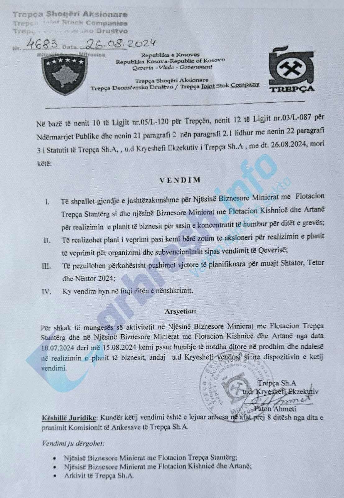Vendimi i nënshkruar nga u.d Kryeshefi Ekzekutiv i Trepçës ka hyrë në fuqi ditën e djeshme.