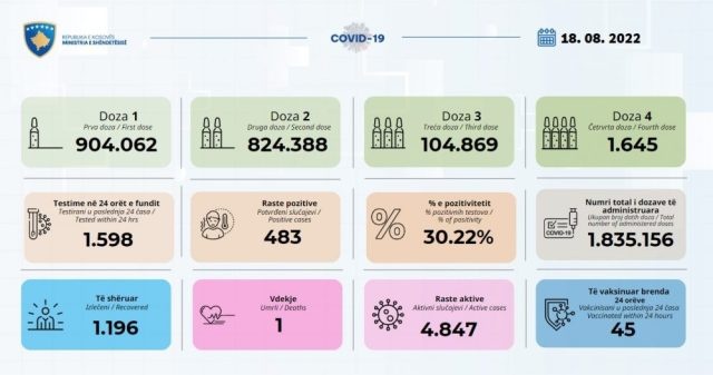Një vdekje dhe 483 raste pozitive janë shënuar gjatë 24 orëve të fundit si pasojë e Covid-19 në Kosovë.
