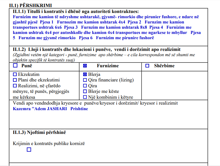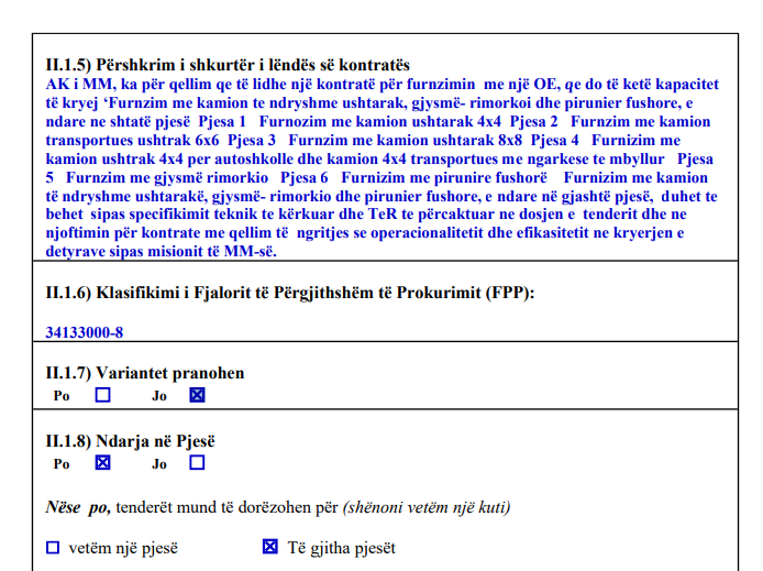 “Furnizim me kamion të ndryshme ushtarakë, gjysmë- rimorkio dhe pirunier fushore, e ndare në gjashtë pjesë, duhet te behet sipas specifikimit teknik te kërkuar dhe TeR te përcaktuar ne dosjen e tenderit dhe ne njoftimin për kontrate me qellim të ngritjes se operacionalitetit dhe efikasitetit ne kryerjen e detyrave sipas misionit të MM-së.”, thuhet në njoftim./arbresh.info/