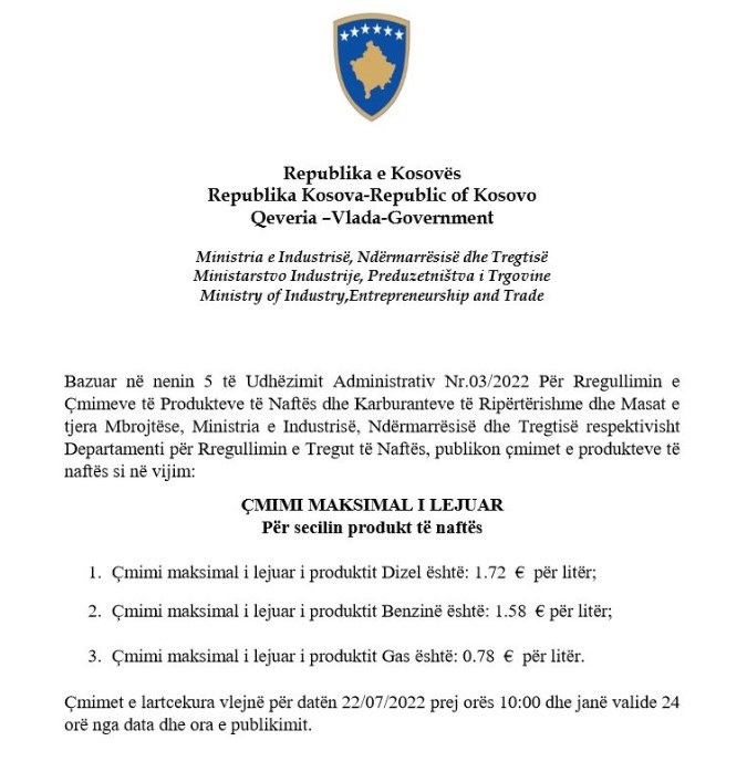 Çmimi maksimal i lejuar i produktit Naftë është: 1.72 € për litër;