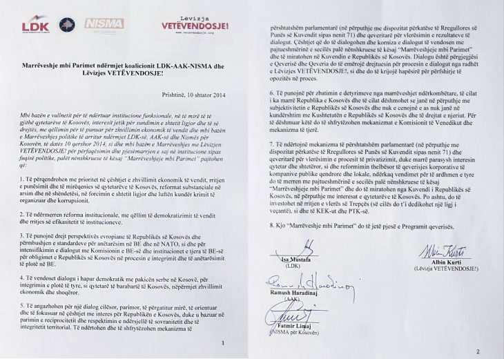 Kujtojmë se marrëveshja ishte nënshkruar mbi parimet ndërmjet koalicionit LDK-AAK-NISMA dhe Vetëvendosje./arbresh.info/