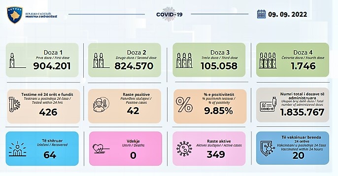 Ministria e Shëndetësisë bën të ditur se në 24 orët e fundit, janë shënuar 42 raste të reja me Covid-19 në Kosovë, nga 426 testime të bëra..