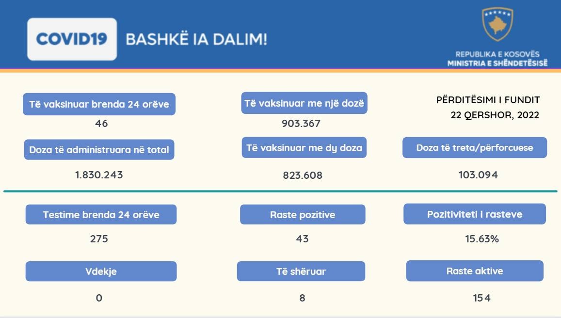Sipas njoftimit, nga 275 testime, 43 qytetarë kanë rezultuar pozitiv me virusin COVID-19.