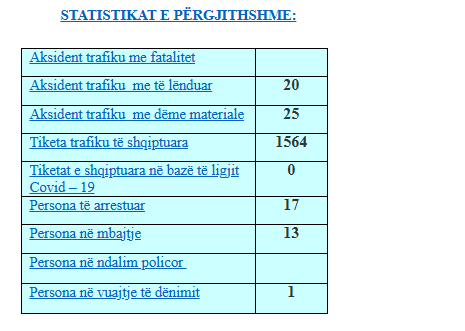Gjatë kësaj kohe, kanë ndodhur 25 aksidente trafiku me dëme materiale dhe 20 me të lënduar.