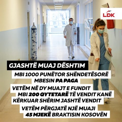“Ministri i Shëndetësisë, shumicën e kohës së tij po e kalon jashtë Kosovës, edhe pse vendi ynë është duke u përballur me probleme të mëdha në sistemin shëndetësorë. Vetëm në gjashtë mujorin e parë të qeverisjes së tij, mbi 1000 punëtor shëndetësorë kanë mbetur tash e tre muaj pa paga; 45 mjek kanë ikur nga Kosova vetëm për një muaj; tash e një vit Ministria e Shëndetësisë nuk ka hapur asnjë konkurs për specializime nga fusha e mjekësisë, ndërsa vetëm për dy muaj mbi 200 qytetarë të vendit tonë, kanë kërkuar shërim jashtë vendit”, thuhet në postimin e LDK-së./arbresh.info/