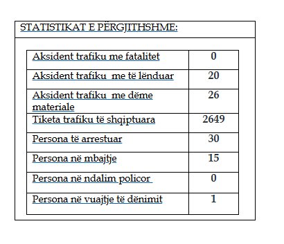 Sipas raportit, në këtë periudhë nuk është shënuar asnjë aksident trafiku me fatalitet, ndërsa janë regjistruar20 aksidente me të lënduar dhe 26 të tjera me dëme materiale.