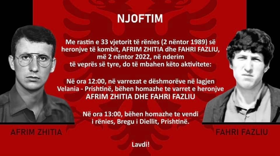 Me rastin e 33 vjetorit të rënies (2 nëntor 1989) së heronjve të kombit, Afrim Zhitia dhe Fahri Fazliu, në nderim të veprës së tyre, nesër do të mbahen disa aktivitete.