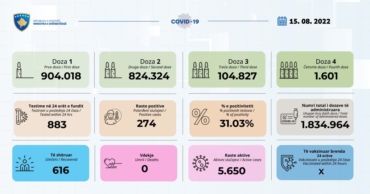 Ministria e Shëndetësisë njofton për 274 raste të reja pozitive me Covid-19.