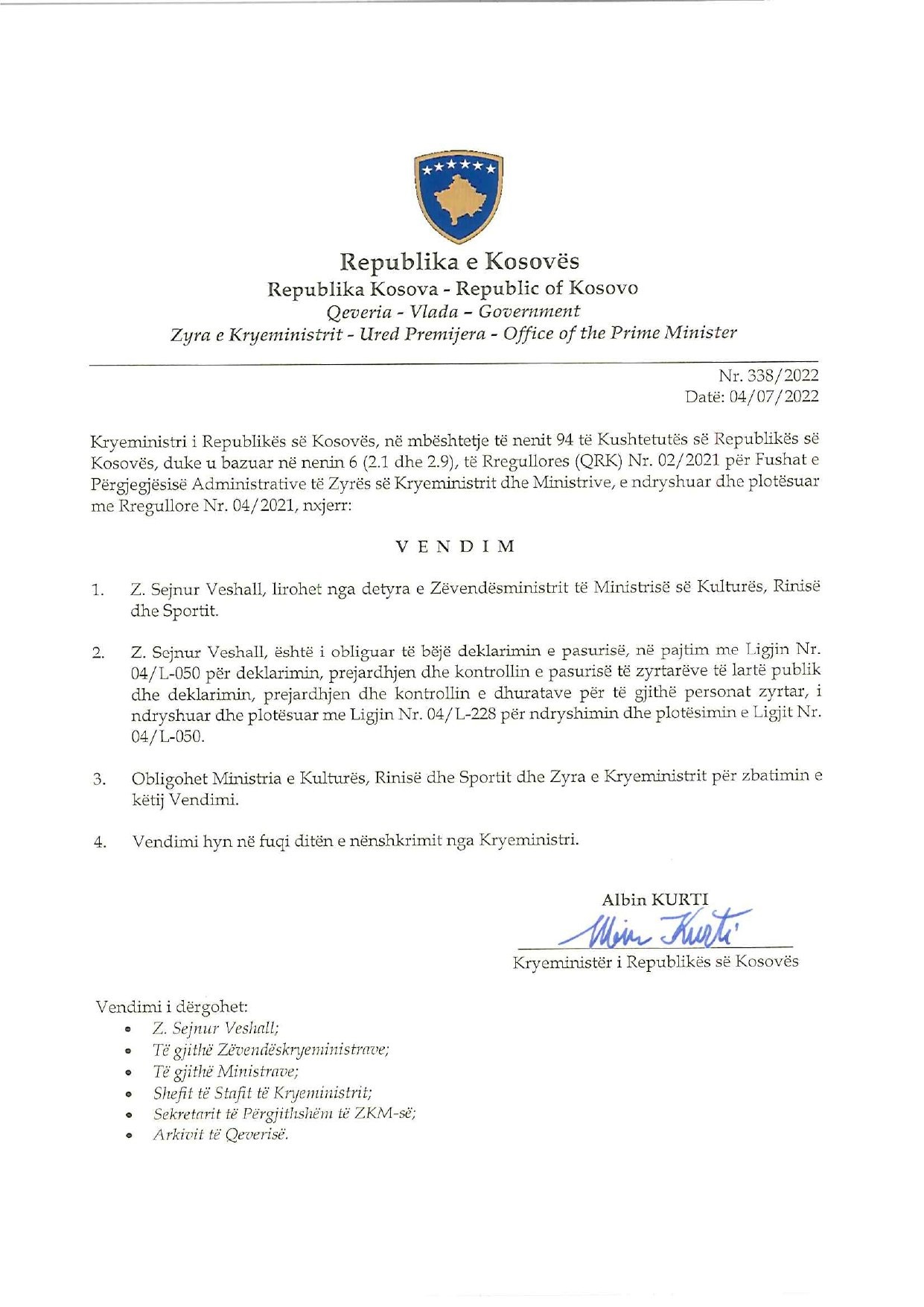 Veshall njoftoi se me kërkesën e partisë “Lëvizja Përparimtare e Romëve të Kosovës (LPRK), e cila e ka propozuar, kryeministri Albin Kurti e ka liruar nga ajo pozitë.