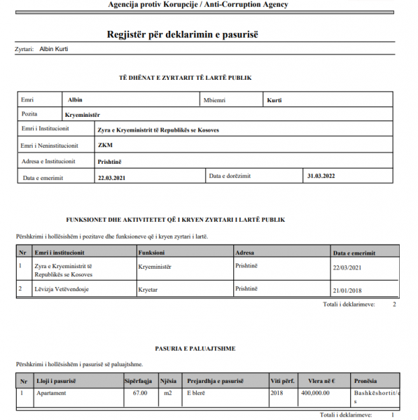 Kryeministri Albin Kurti ka deklaruar pasurinë e tij për vitin 2021 në Agjencinë Kundër Korrupsionit.