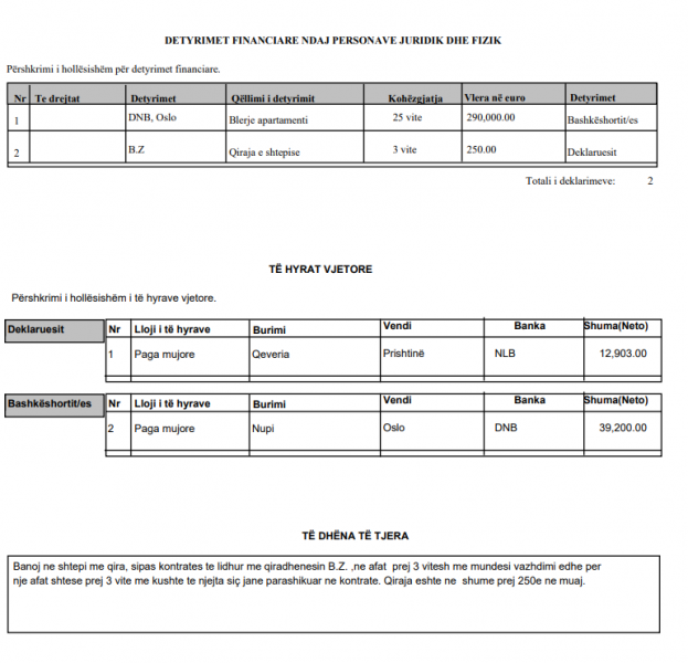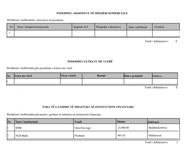 I pari i Qeverisë ka deklaruar se ka para të gatshme në bankë në vlerë prej rreth 400 euro, derisa bashkëshortja e tij ka të kursyera 23 mijë euro./arbresh.info/