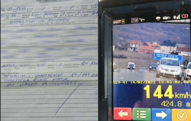 Në zonën ku kufizimi i shpejtësisë është 80 km/h identifikohet shoferi duke drejtuar mjetin me 144 km/h (gjobitet me 300€ dhe 3 muaj i ndalohet drejtimi i mjetit me veprim motorik).