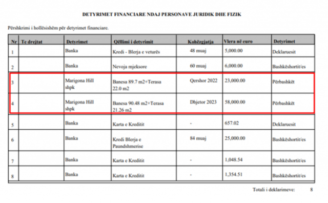 Për blerjen e njërës nga banesat, që është 111.7 metra katrorë bashkë me tarracë, Aliu ka deklaruar se i ka borxh 23 mijë euro, kurse për banesën tjetër ka deklaruar borxh 58 mijë euro./arbresh.info/