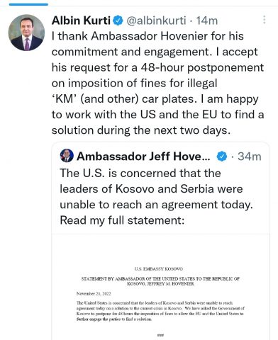 “E falendëroj Ambasadorin Hovenier për përkushtimin dhe angazhimin e tij. E pranoj kërkesën e tij për një shtyrje 48 orëshe për dhënien e gjobave për targat ilegale KM (dhe të tjera). Jam i lumtur të punoj me SHBA-në dhe me BE-në për të gjetur një zgjidhje gjatë dy ditëve të ardhshme”, ka shkruar Kurti në Twitter.