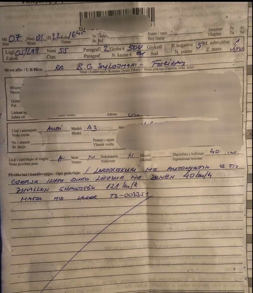 Policia e Kosovës në Ferizaj e ka gjobitur me 500 euro gjobë, pesë pikë negative dhe ia mori lejen për një vit, një 19-vjeçari që voziti 121km/h në rrugën “Gursel e Bajram Sylejmani”, në Ferizaj.