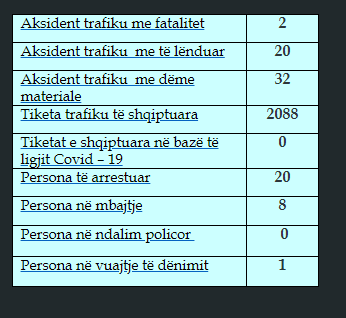 Sipas raportit 24-orësh të policisë, gjatë 24 orëve të fundit janë evidentuar disa aksidente në trafikun rrugor, dy aksidente kanë përfunduar me fatalitet, 20 aksidente kanë qenë me lëndime, ndërsa 32 me dëme materiale.